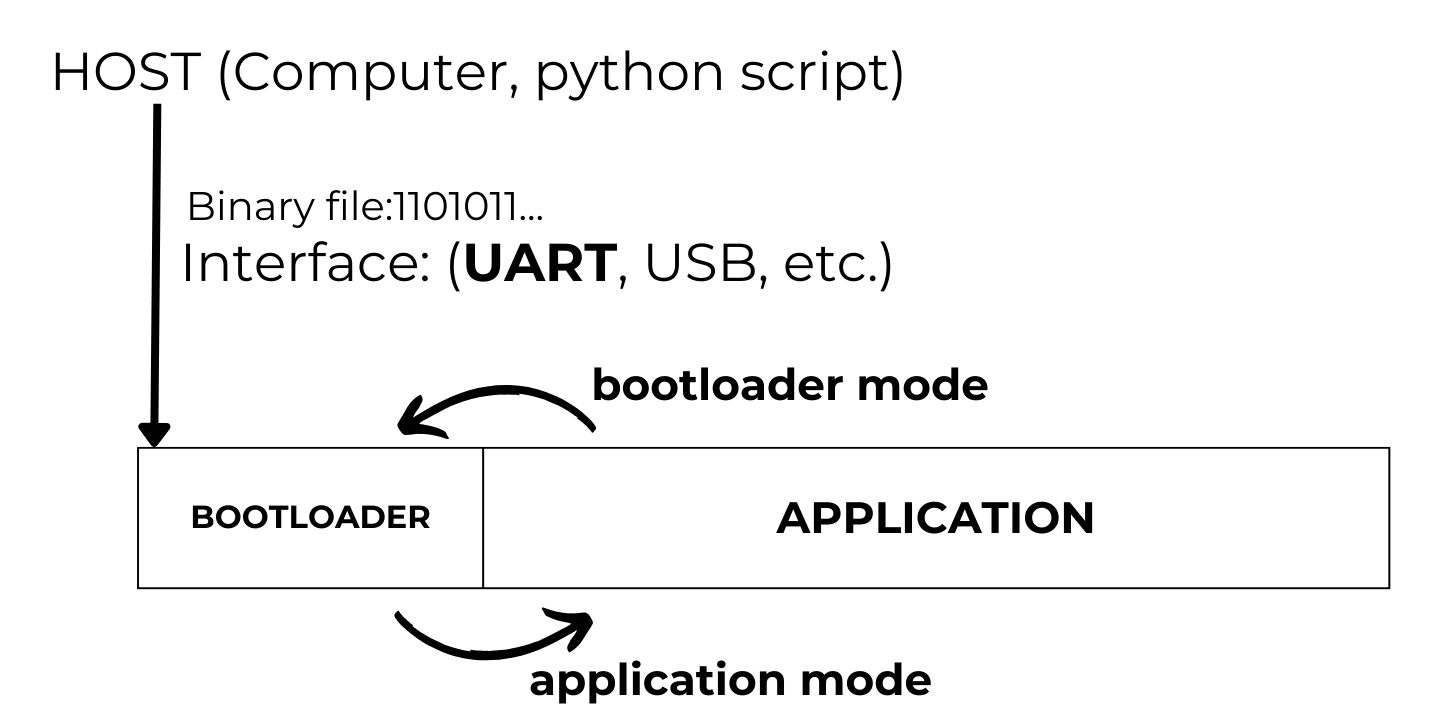 When designing a bootloader, we allocate a small portion of flash memory to the bootloader code. The rest will be devoted to the application code. When triggering the application - setting a particular GPIO pin or sending a UART command - the MCU will jump to the bootloader. Then it updates the application code by receiving binary data over an interface (e.g., UART, Bluetooth). Once the application code renews, the MCU can return to the application. The image below illustrates how it works.