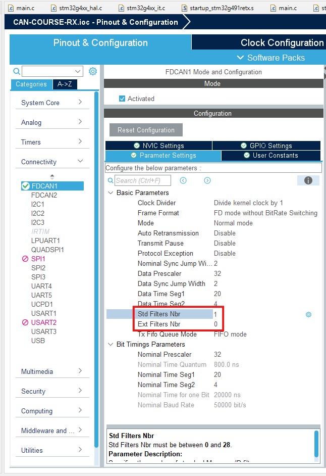 The final important topic is STM32 CAN Filtering. As I mentioned in the first part, Filtering is an essential function of the CAN interface that minimizes computational load on nodes. To configure the filters, first define the number of filters, one for extended and one for standard IDs. In my example, I set the 'Std Filters Nbr' to 1. Then, we can save the file to generate the code.