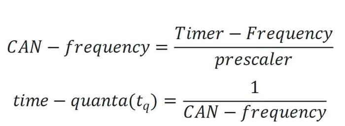 The CAN Interface has no clock to synchronize the data segments. Hence, perfect timing is crucial for the proper operation of the bus. For that reason, the bit time is divided into different regions to adjust the sampling point of the data: Synchronization segment, Bit segment 1, and Bit segment 2. The synchronization segment points to the start of the bit time, and its duration is always a single time quanta (a single time quanta). Bit segment 1 (BS1, Phase segment 1 in STM32 CAN) defines the location of the sample point, while Bit segment 2 (BS2, Phase segment 2 in STM32 CAN) defines the location of the transmit point.